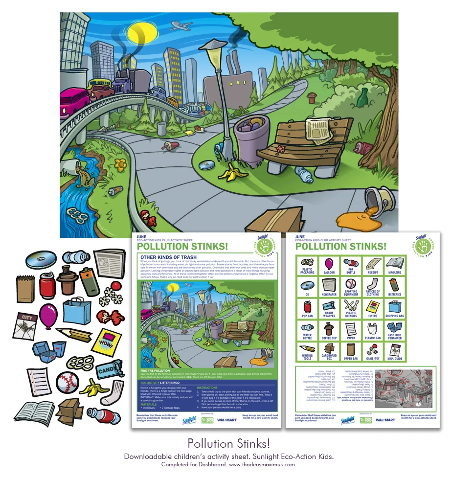 Created as the June Sunlight Eco-Action Kids downloadable activity sheet, members were provided with two activities. One was an object search of specific pollutants vs recyclable materials, and the second was a bingo sheet that could be played with friends or fellow class mates.